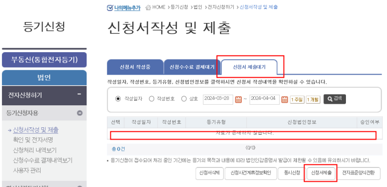 이후 신청서작성 및 제출 메뉴, 신청서 제출대기 메뉴에서 신청서를 찾아 신청서 제출 클릭.