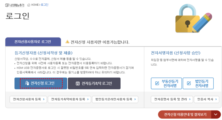 2. 전자신청 로그인 클릭, 준비해둔 대법원 USB 전자증명서 로그인을 하라