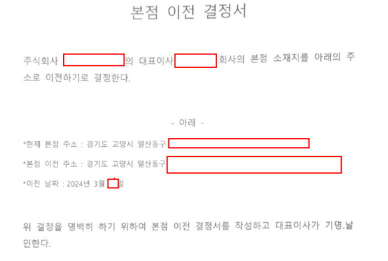 b) 본점 이전 결정서(대표 이사 날인) - 본점 이전 결정서는 아래와 비슷하게 스스로 워드로 만들던가 인터넷 쳐보면 양식 많음.