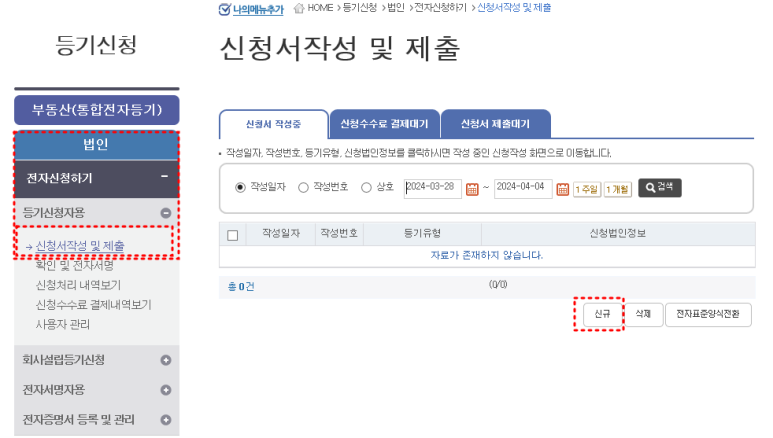 3. 법인, 전자신청하기, 등기신청자용, 신청서작성 및 제출 메뉴, 신규 클릭